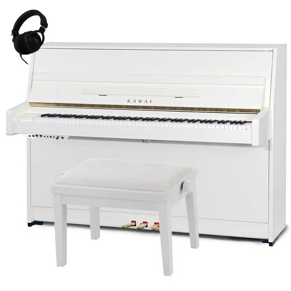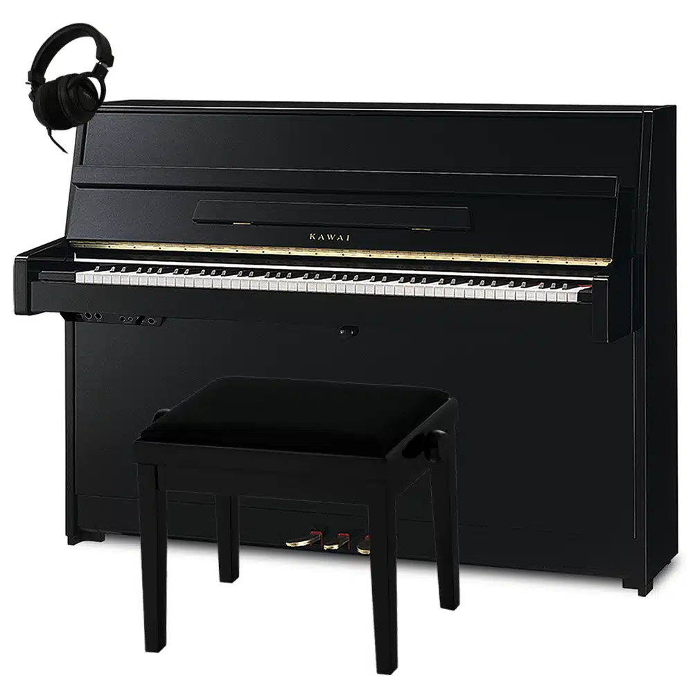 Le Kawai K15 E dispose d’un design sobre et élégant avec ses 3 finitions au choix : noir brillant, blanc brillant ou acajou brillant. Avec une hauteur de 110 cm, une largeur de 149 cm et une profondeur de 54 cm, ce piano droit est idéal pour les espaces réduits tout en offrant une présence visuelle raffinée. Sa finition en ébène poli ajoute une touche de sophistication, faisant de cet instrument un véritable objet de décoration autant qu’un outil musical.