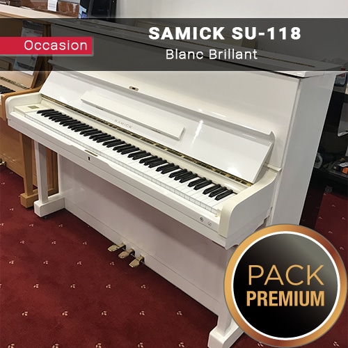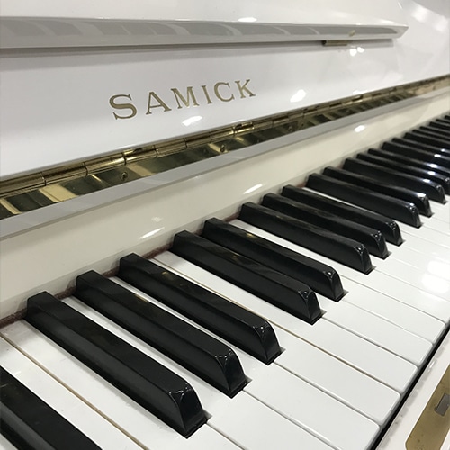 Piano droit SAMICK modèle SU-118 SP n° IMH00484 en finition Blanc Brillant proposant une mécanique SAMICK précise et robuste ainsi que les meilleurs matériaux.