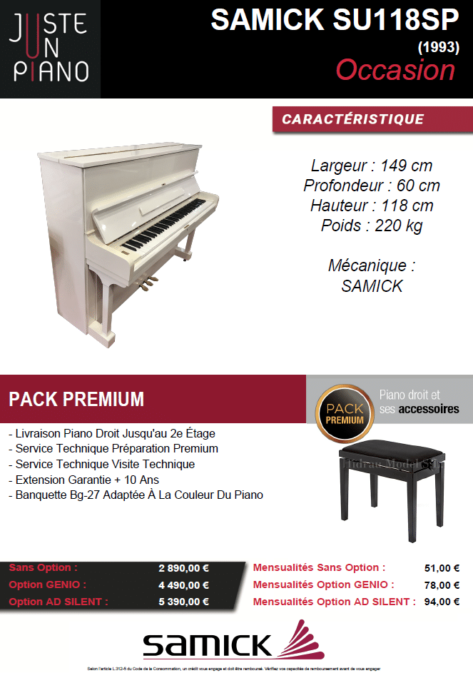 Caractéristiques du Piano SAMICK modèle SU118SP Blanc Brillant – Piano droit OCCASION