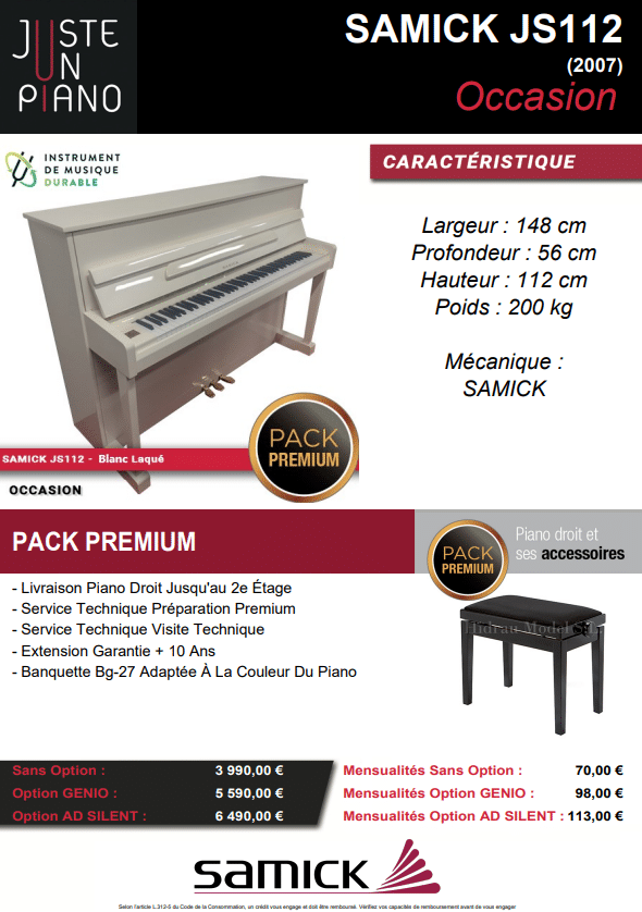 Caractéristiques du SAMICK JS112 Blanc Laqué – piano droit OCCASION