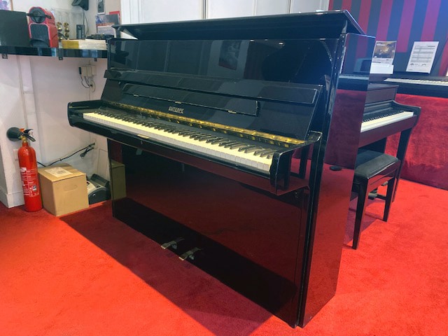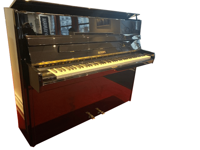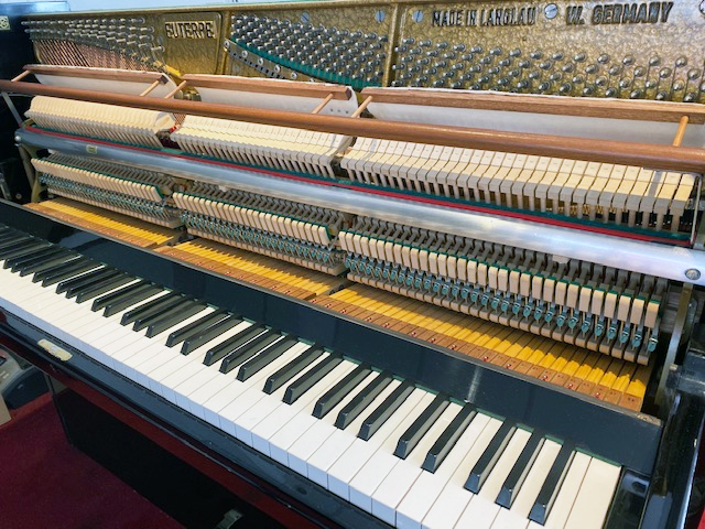 Ce piano droit EUTERPE 112 « modern » noir brillant est une splendeur à tous les niveaux ! Sorti des ateliers de Langlau en Bavière en 1981, nous voici revenus à « la belle époque » où les artisans d’art facteurs de pianos produisaient entièrement à la main de superbes instruments, même de petite taille, sur le même cahier des charges que leurs grands pianos de concert. Une époque révolue qui a vu disparaître ces modèles de pianos droits artisanaux compacts du catalogue des rares et prestigieuses marques européennes qu’il nous reste encore aujourd’hui face à la mondialisation, à l’industrialisation de masse mais surtout avec la mode du « consommable » pratique et tout numérique!